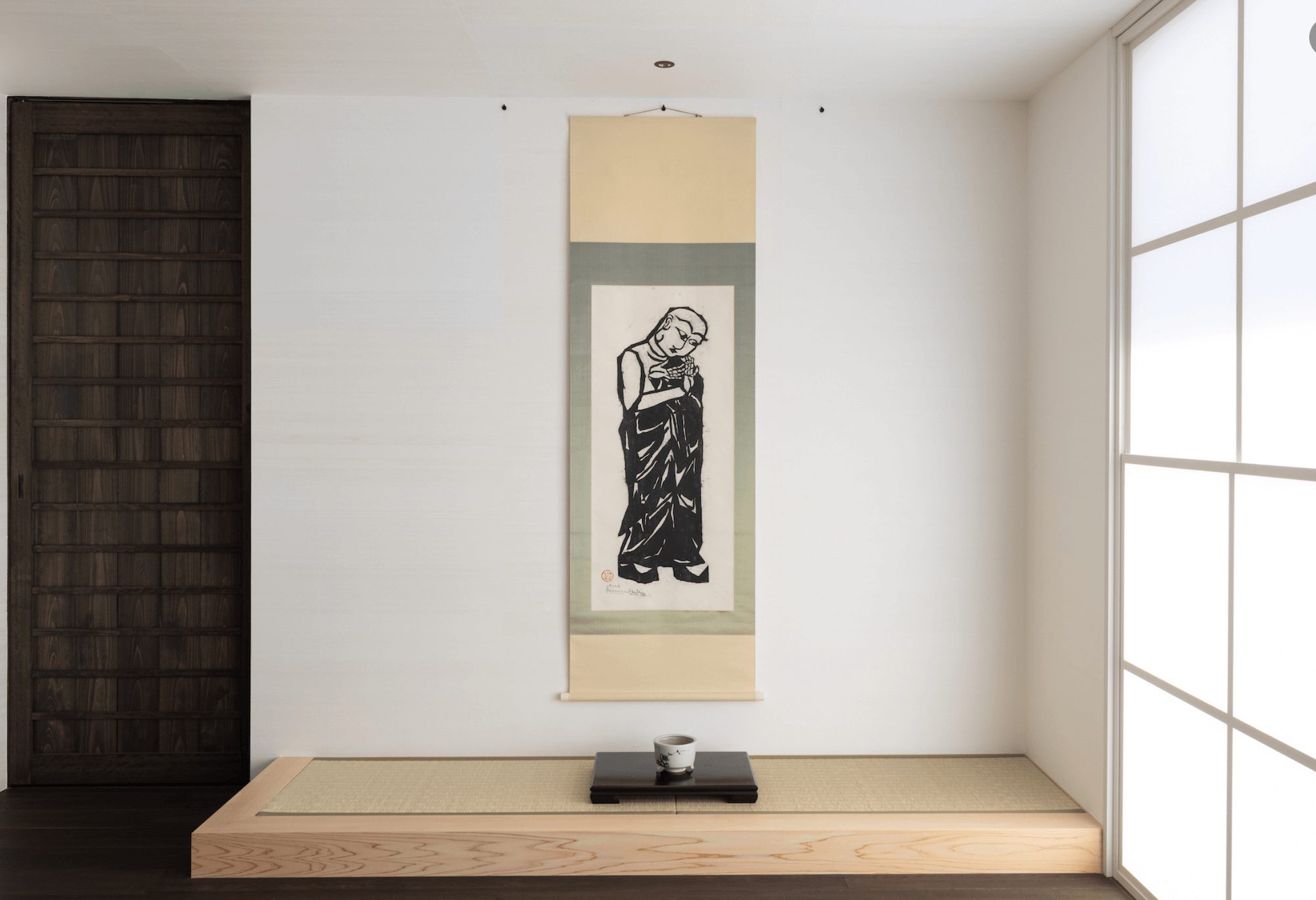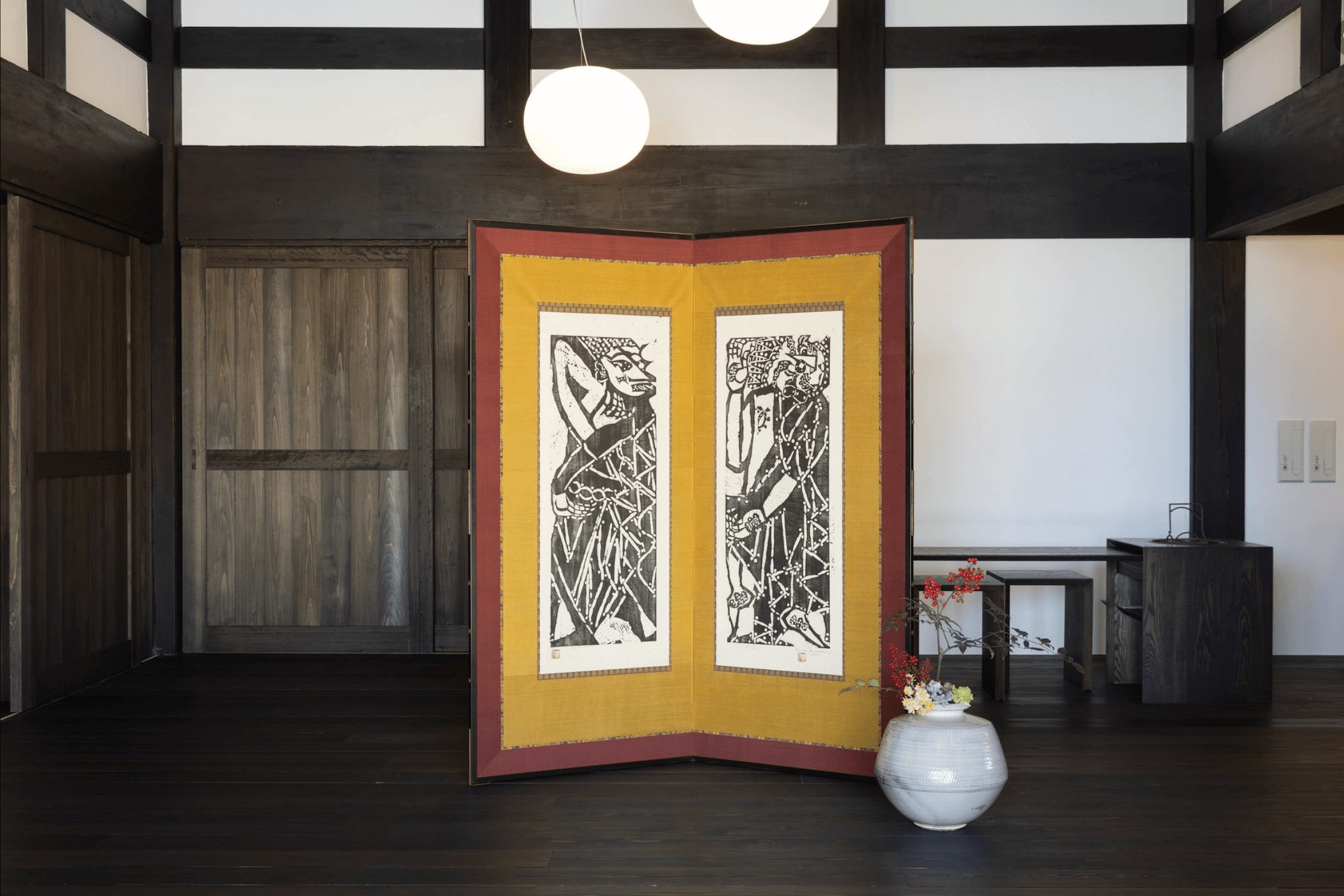 そのほかにも、「善知鳥板画巻 / 夜訪の柵(よどいのさく)」「耶蘇十二使徒板画柵/二枚折屏風」「鐘渓頌 若栗の柵」「不来方板画柵/看病シテヤリの柵」など、棟方の代表的な版画作品と、濱田庄司、河井寛次郎、芹沢銈介といった民藝の代表的な作家の作品、安川慶一コレクション(70年ほど前の各地の民藝品)を客室・ブティックで展示販売します。