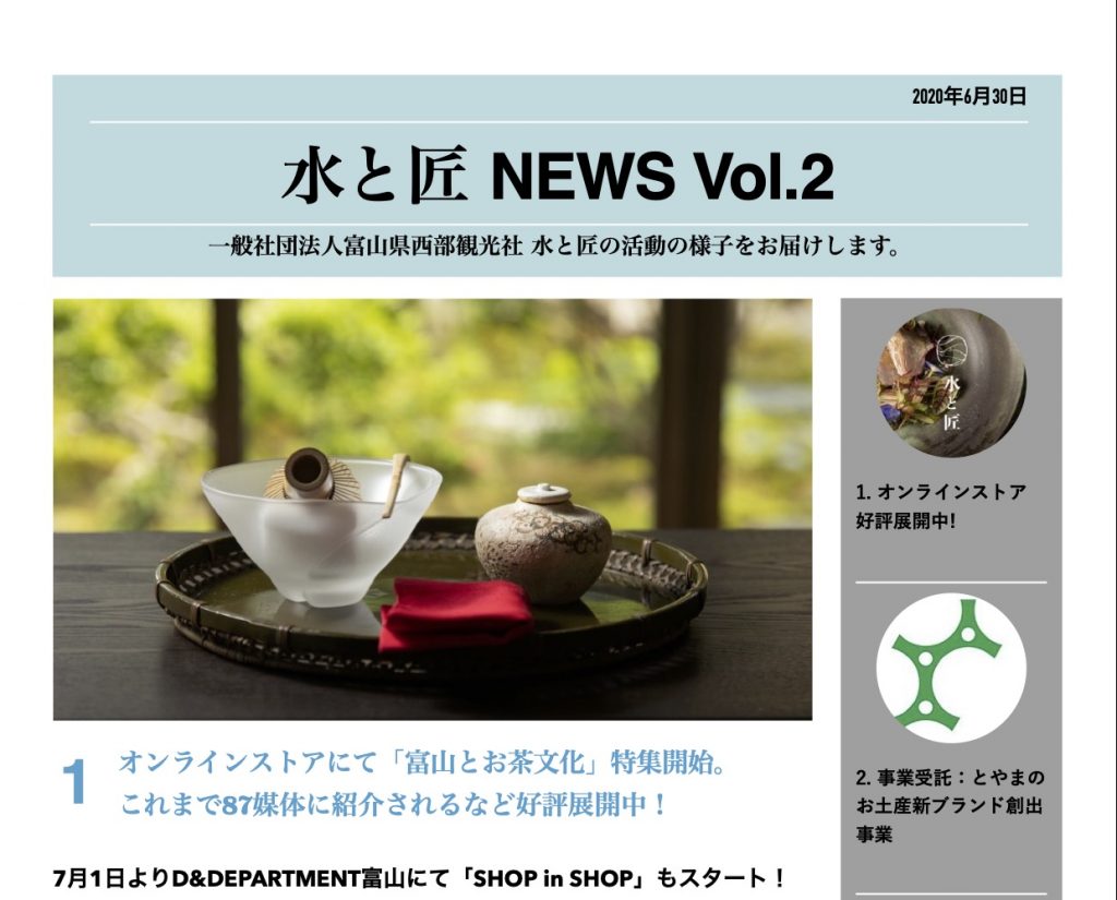 不定期発行の「水と匠NEWS Vol.2」は、先月始まったD&DEPARTMENT TOYAMAさんでの”Shop in Shop” 企画のほか、県の「とやまのお土産新ブランド創出事業」の企画運営受託、総務省の「関係人口創出・拡大事業」についてなど。ニュースの全文をはこちら。ぜひご覧ください。