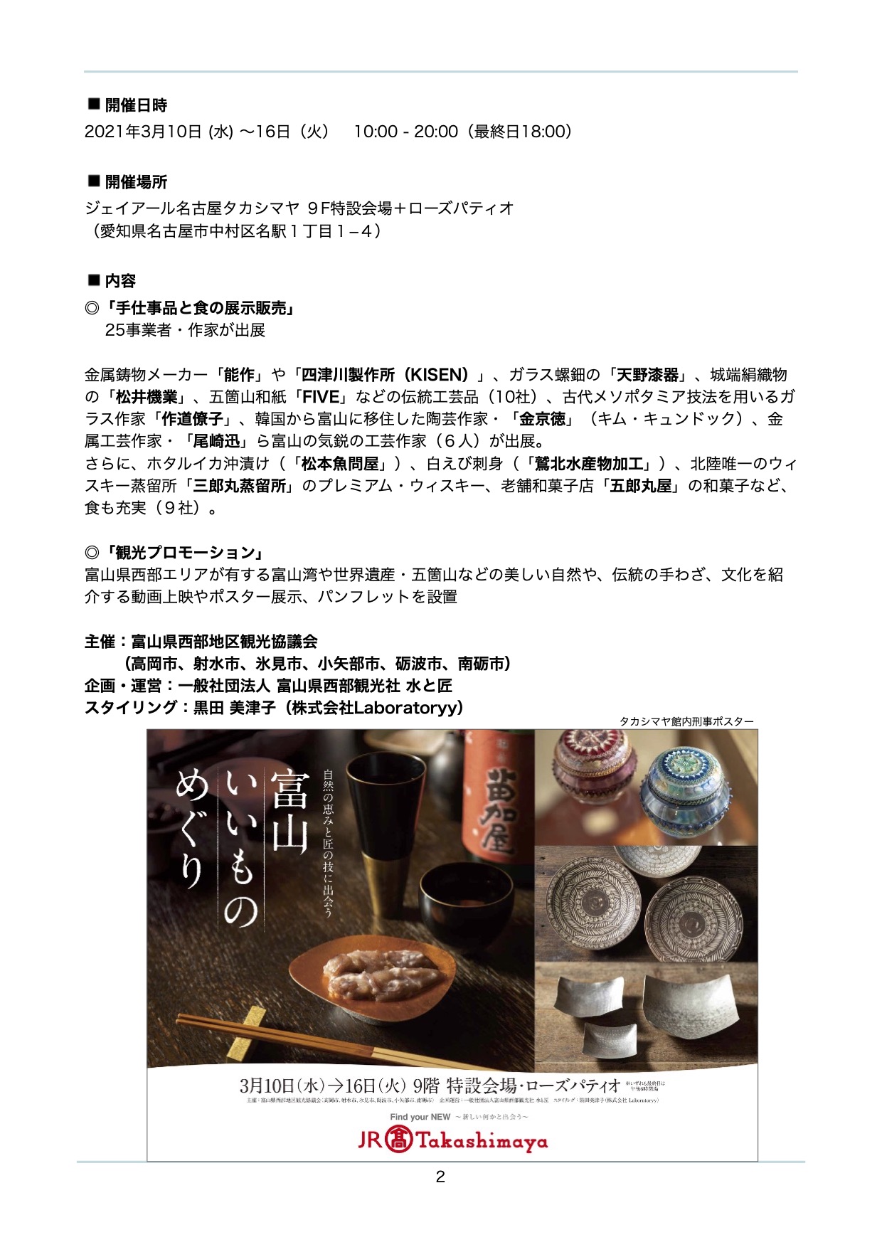 富山県西部地区観光協議会(以下:協議会)は、一般社団法人 富山県西部観光社 水と匠(代表理事: 稲垣晴彦 )と連携し、アフターコロナを見据えた観光誘客につなげるため、日本有数の売り上げを誇 るジェイアール名古屋タカシマヤのリビングフロアにおいて、2021年3月10日(水)~16日(火)ま で、「工芸品」や「食」を展示・販売する観光PR事業「富山いいものめぐり」を開催します。 これはジェイアール名古屋タカシマヤで初となる 「富山特集」の催事となり、富山の産品を通じて地域の価値を最大限に発信いたします。