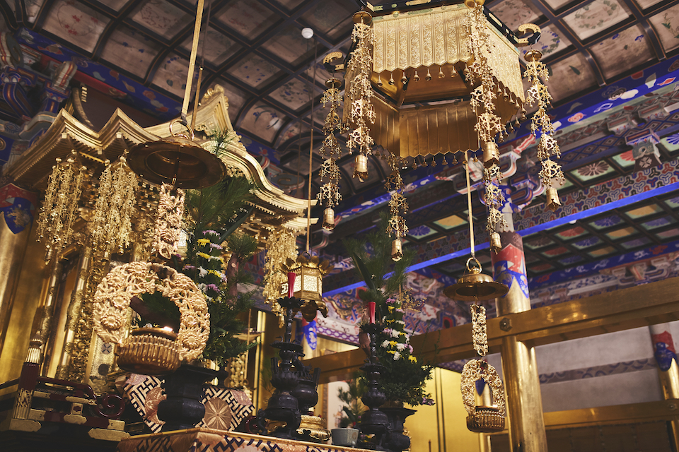 ちょうど「報恩講」が終わったばかりの本堂では、銅製の仏具がもっともフォーマルな形式で配置されているのを見ることができた。