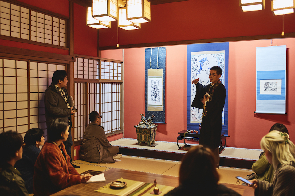 善興寺は奈良の飛鳥にあった日本最古の寺院を源流とする、とても歴史の古いお寺だ。民藝とのゆかりも深く、本堂には棟方志功が富山への疎開時代の最後に描いた「御二河白道之柵」が、通常非公開の別室には棟方の肉筆画や版画が展示されている。